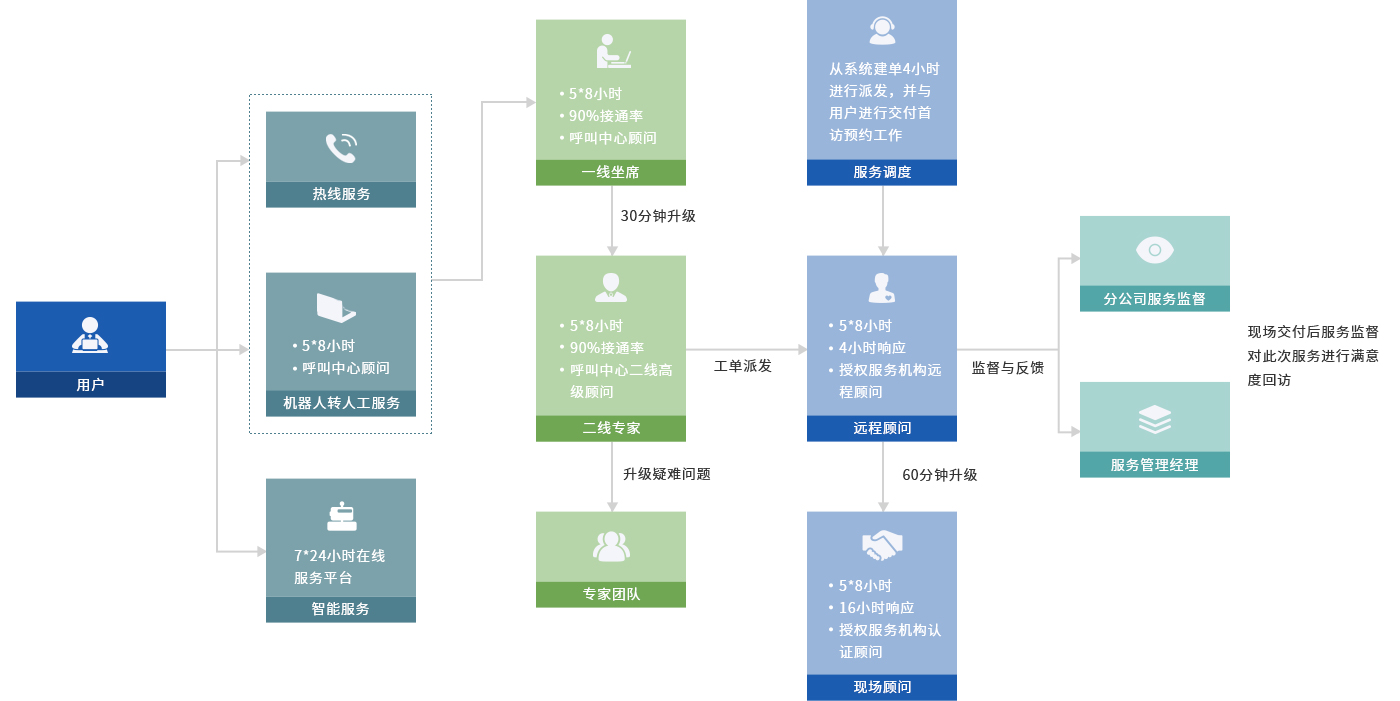通过统一的服务资源调度,依托雄厚的技术实力,集中新彩官网海岳全国优质服务资源,专家级工程师及与产品研发部门紧密衔接,迅速专业响应客户服务请求,实现高质量的服务保障;并通过严密的监控、质控、SLA度量机制确保客户服务满意,使客户可以更好的使用新彩官网海岳软件,提升应用和业务水平,推动企业管理进步