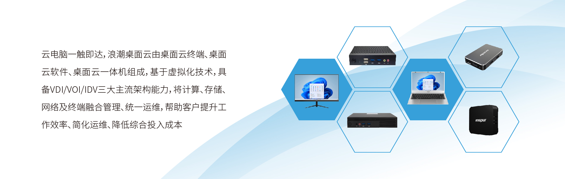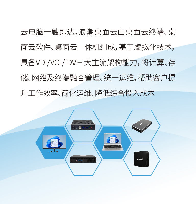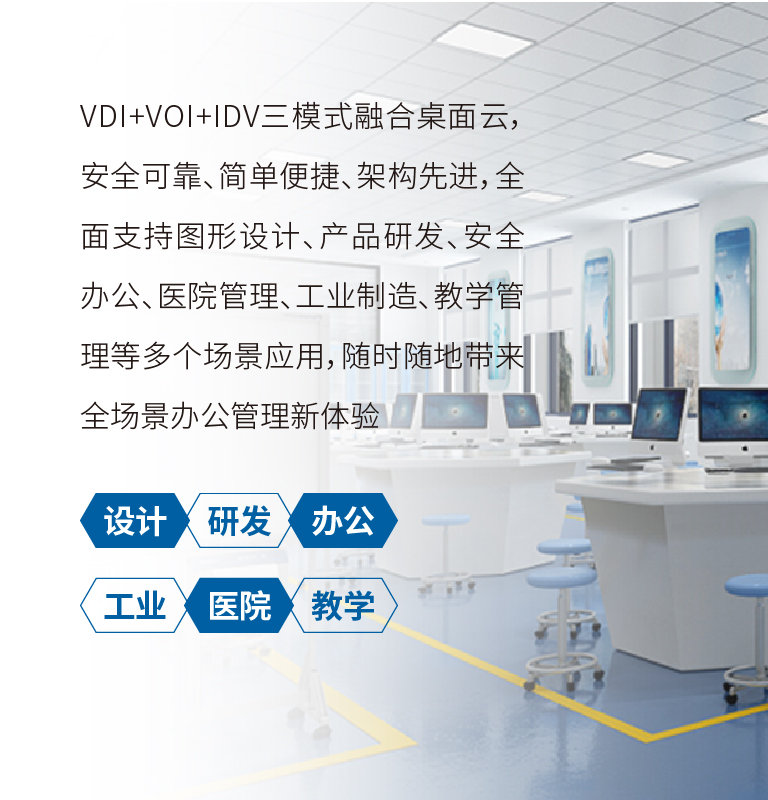 桌面云全系列产品包括:桌面云终端、桌面云软件、桌面云一体机等。桌面云基于虚拟化技术,具备VDI、VOI、IDV架构能力,将计算、存储、网络及终端融合管理、统一运维,帮助客户提升工作效率、简化运维、降低IT综合投入成本,全面支持图形设计、产品研发、安全办公、医院管理、工业制造、教学管理等多个场景。